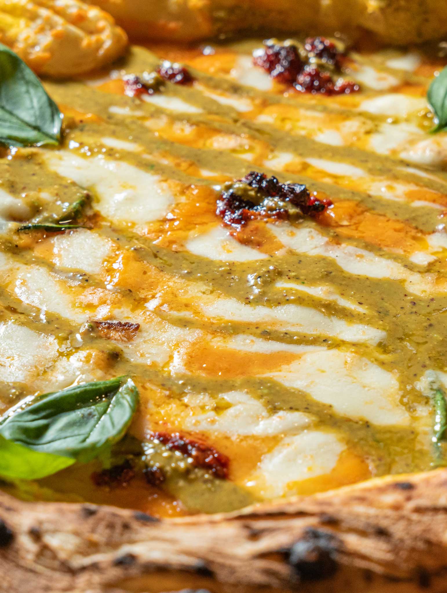 Candela: salsa de tomates, mozzarella fior di latte, salami picante, burrta, pesto de albahaca, miel y parmesano.